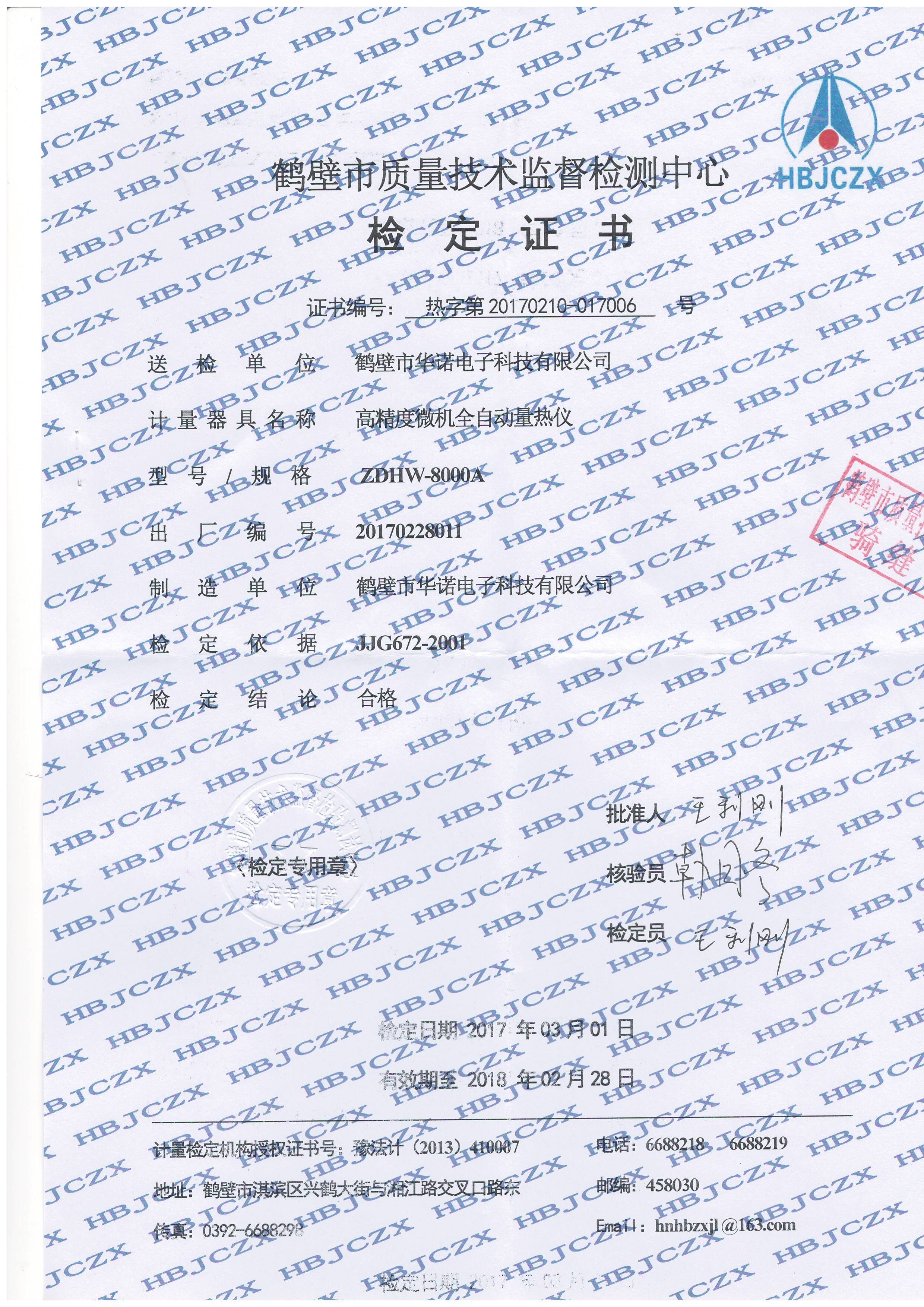 鶴壁市華諾電子科技有限公司是一家專業研制、生產煤質采制樣分析儀器儀表的高新技術企業。在社會經濟高度發達的今天,我公司長期堅持“質量產生效益,質量贏得市場”的理念矢志不移。如今公司在質量管理方面已經形成了一套完整的體系,上周經過公司相關部門討論,領導決定為出廠的每臺量熱儀辦理“身份證”,即生產的任何型號的量熱儀都要通過鶴壁市質量技術檢測中心檢定并且合格才能出廠運送給客戶使用,鶴壁市質量技術檢測中心會為接受檢定的量熱儀出具檢定證書,上面會詳細的標出量熱儀的型號、出廠編號、檢定結果等。鶴壁市華諾電子科技有限公司要讓每一位客戶買的放心、用的舒心。